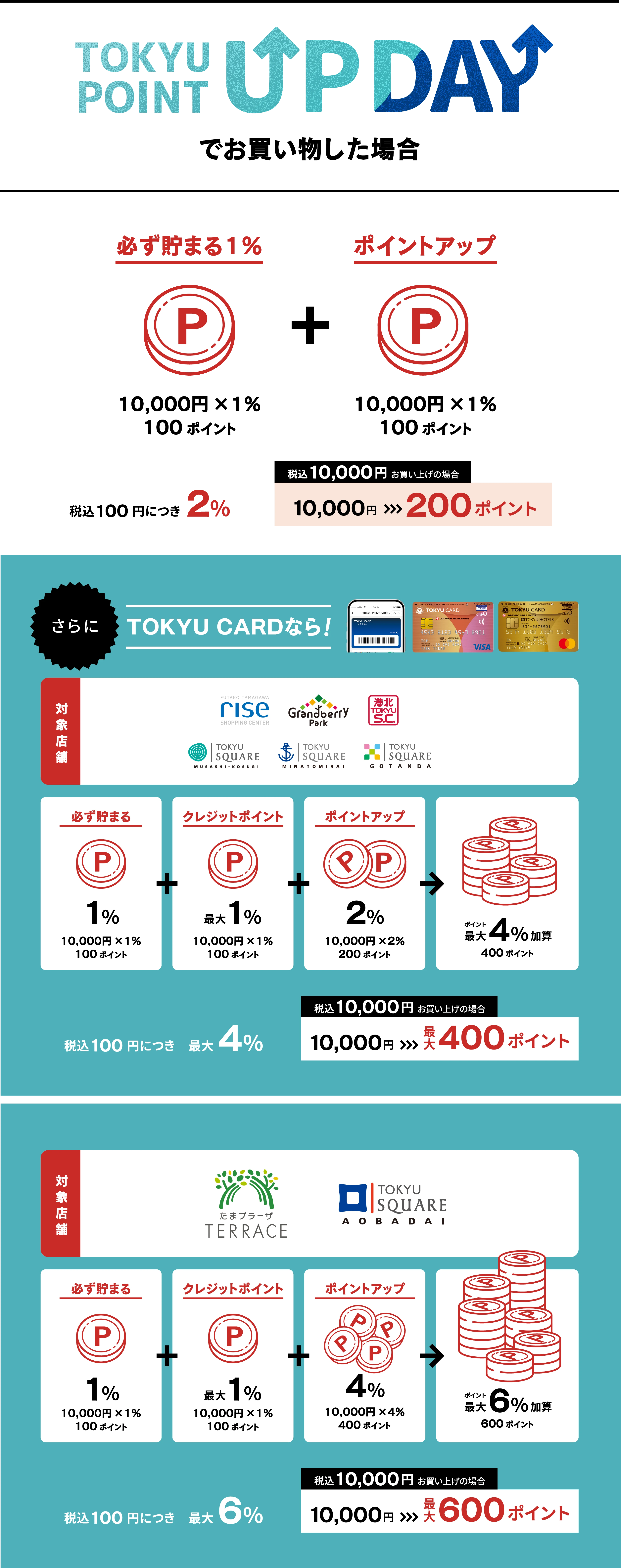 【TOKYU POINT CARD/TOKYU CARD】 ※一部ポイント加算対象外の決済・店舗がございます 【TOKYU CARD】 ※税込100円につき合計最大4%(たまプラーザ テラス、青葉台東急スクエアのみ最大6%)にはクレジットポイント(税込100円につき最大1%)が含まれます ※クレジットポイント加算率は、ご利用カードの種類により異なります ※レシートには、クレジットポイント分は記載されません ※クレジットポイントは、後日加算いたします ※ポイントアップキャンペーンが重なった場合、他のキャンペーンが優先となる場合がございます