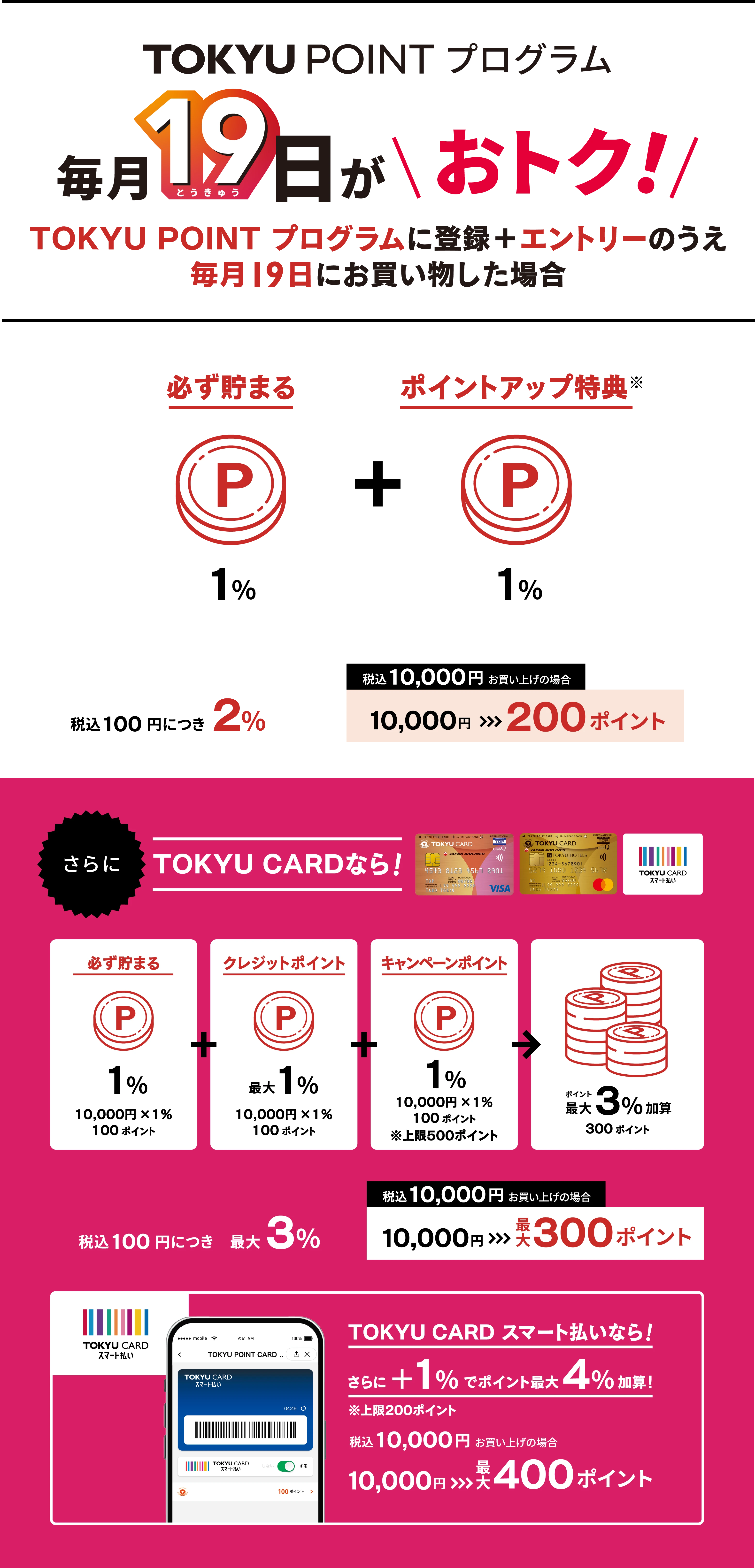【TOKYU POINT UP DAY/毎月19日がおトク!】※一部ポイント加算・利用対象外の決済・店舗がございます。また、対象の店舗・施設は予告なく変更となる場合がございます ※レシートには・ クレジットポイント加算率は、ご利用カードの種類により異なります ※レシートには、クレジットポイント分は記載されません ※クレジットポイントは、後日加算いたします 【TOKYU POINT UP DAY】※税込100円につき合計最大4%(たまプラーザ テラス、青葉台東急スクエアは6%)にはクレジットポイント(税込100円につき最大1%)が含まれます ※ポイントアップキャンペーンが重なった場合、他のキャンペーンが優先となる場合がございます 【毎月19日がおトク!】※エントリーがない場合、本キャンペーンの対象外となります ※本特典は毎月エントリーが必要です。前月以前に一度エントリーされていた場合でも、当月のエントリーがない場合は特典対象外となります ※ポイント加算時に参加条件を満たしていない場合やTOKYU CARDもしくはTOKYU POINTCARD(提携カード含む)を退会された場合は、本特典の提供対象外となります ※エントリー期間内であれば、お買い上げ後にエントリーした場合も対象となります ※お買い上げいただいた後、返品した場合はご利用金額の対象外となります ※金券類やプリペイド式カード(チャージ含む)の購入など、TOKYU POINT加算対象外商品の購入は対象外となります ※「毎月19日のお買い物で貯まる+1%ポイント」および「TOKYU CARDスマート払いのご利用で貯まる+1%ポイント」は翌月末までに加算いたします ※「毎月19日のお買い物で貯まる+1%ポイント」および「TOKYU CARDスマート払いのご利用で貯まる+1%ポイント」の加算上限はそれぞれひと月あたり500ポイント、200ポイントとなります ※家族カードや複数枚カードをお持ちの場合、それぞれエントリーをいただいた場合でも、ポイント加算はひと月あたり合計700ポイントとなります。また、本特典のエントリーは毎月1回のみとなります ※本特典は予告なく変更または終了の場合がございます
